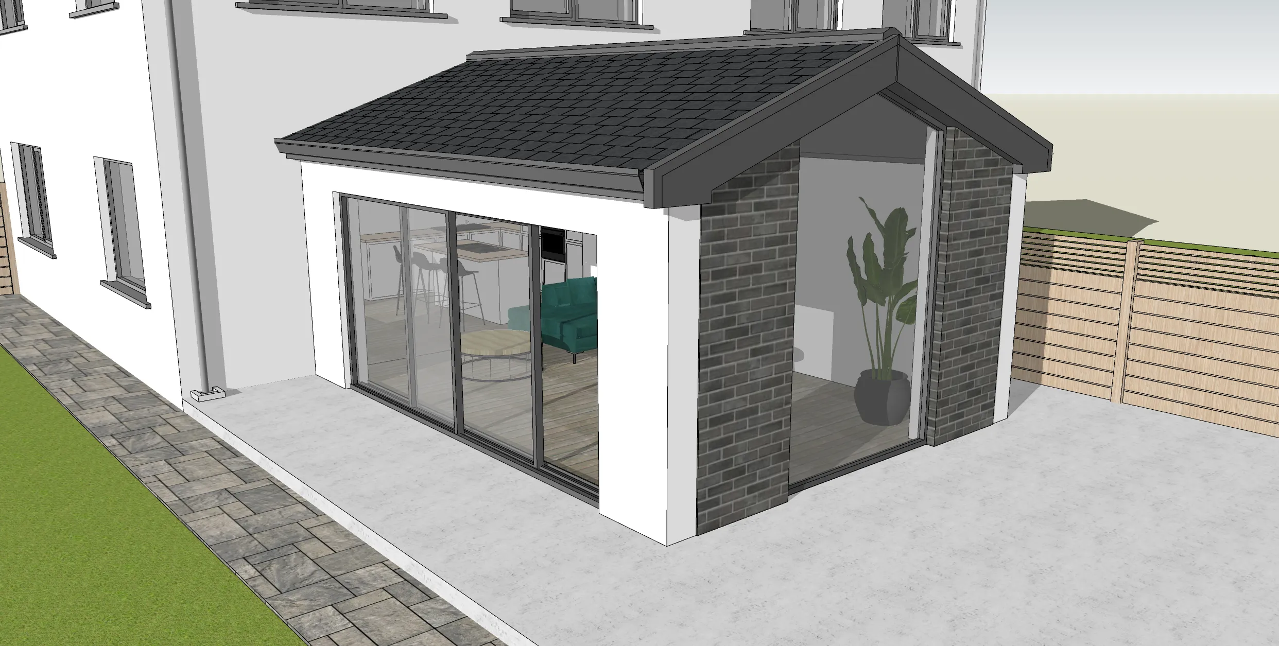 hup! is fully compatible with existing basework, so unless a homeowner wishes to extend or change the footprint of their existing conservatory, no basework is required - eliminating an often tricky, time consuming, and weather dependent part of the project. The immense flexibility of the hup! system means that one footprint can yield an incredible choice of designs as can be seen here, featuring hup! walls, along with windows and doors, and a huge choice of wall finishes. Such is the flexibility of the system that each and every hup! is bespoke – allowing homeowners total design flexibility and roof choice too (roof shape can be changed from a traditional conservatory shape to a flat roof with lanterns for example. Or a Georgian roof can be changed to the more modern gable etc).
